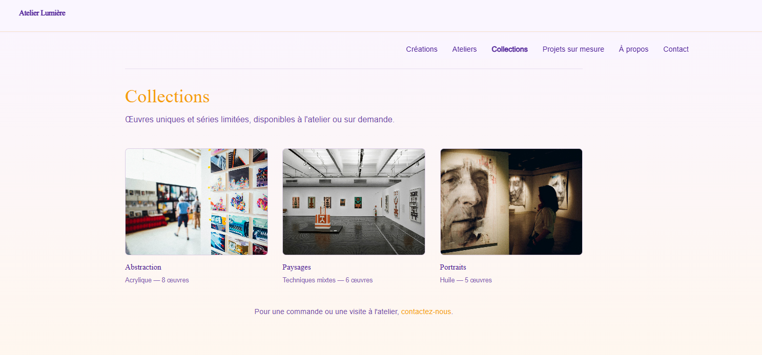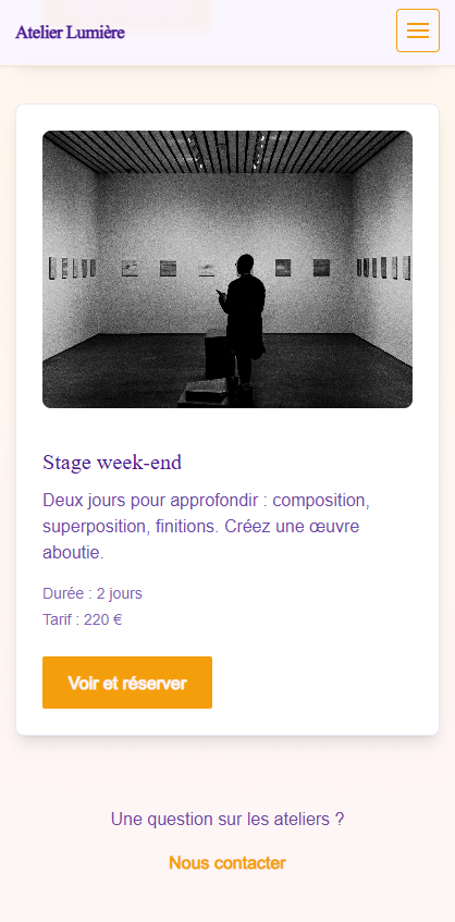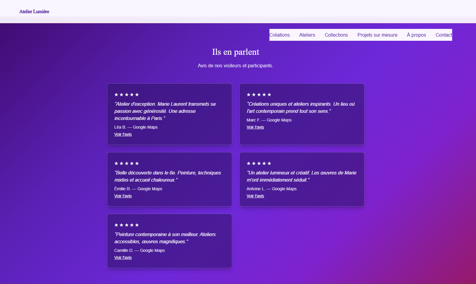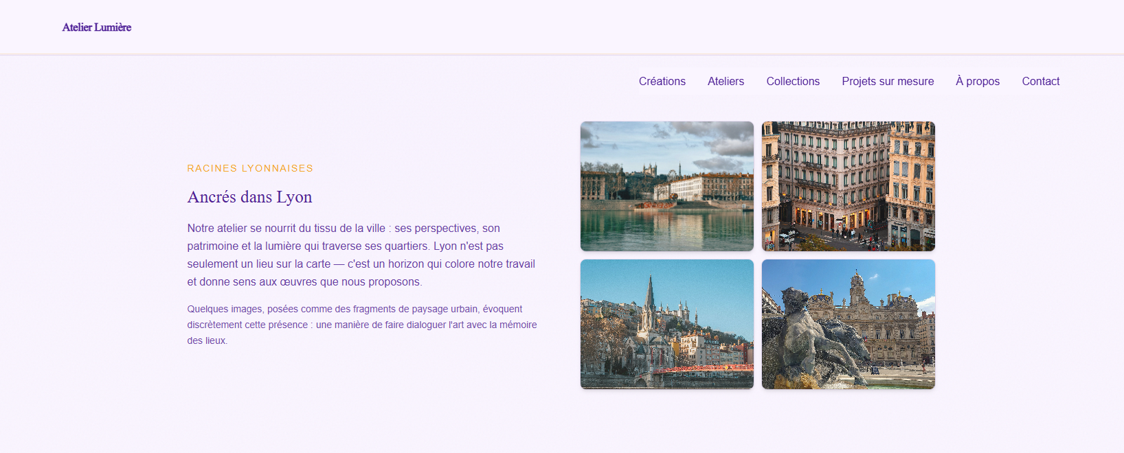 Site vitrine pour Atelier lumière : présentation de l'identité, galerie visuelle, informations pratiques et prise de contact. Design épuré avec une palette verte, typographie lisible et parcours utilisateur clair. Réalisé avec Next.js et React, déployé sur Vercel.