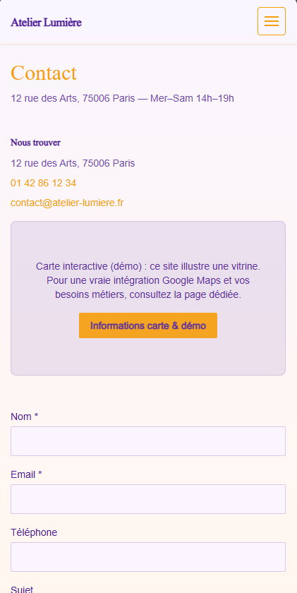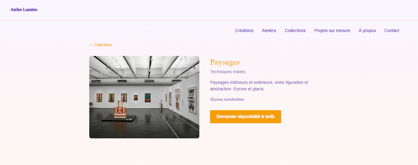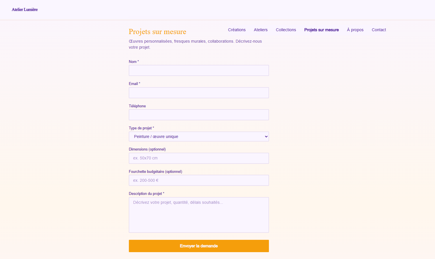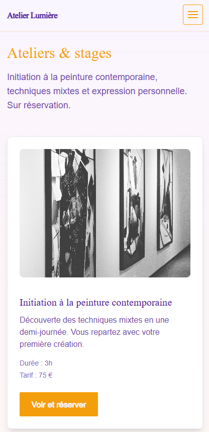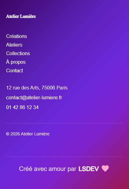 Site vitrine pour Atelier lumière : présentation de l'identité, galerie visuelle, informations pratiques et prise de contact. Design épuré avec une palette verte, typographie lisible et parcours utilisateur clair. Réalisé avec Next.js et React, déployé sur Vercel.