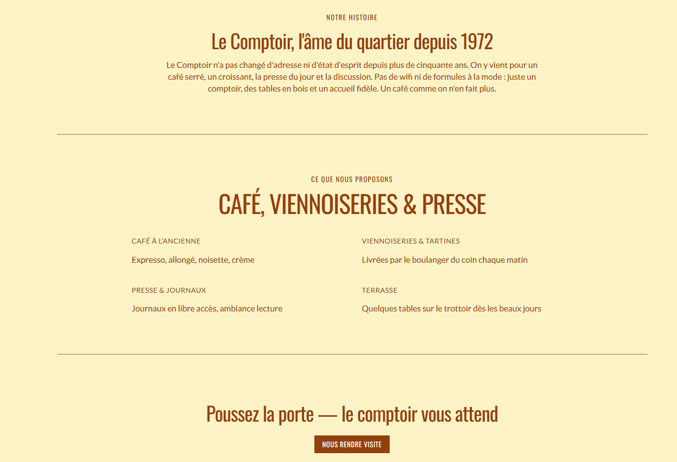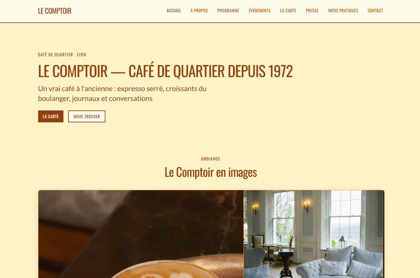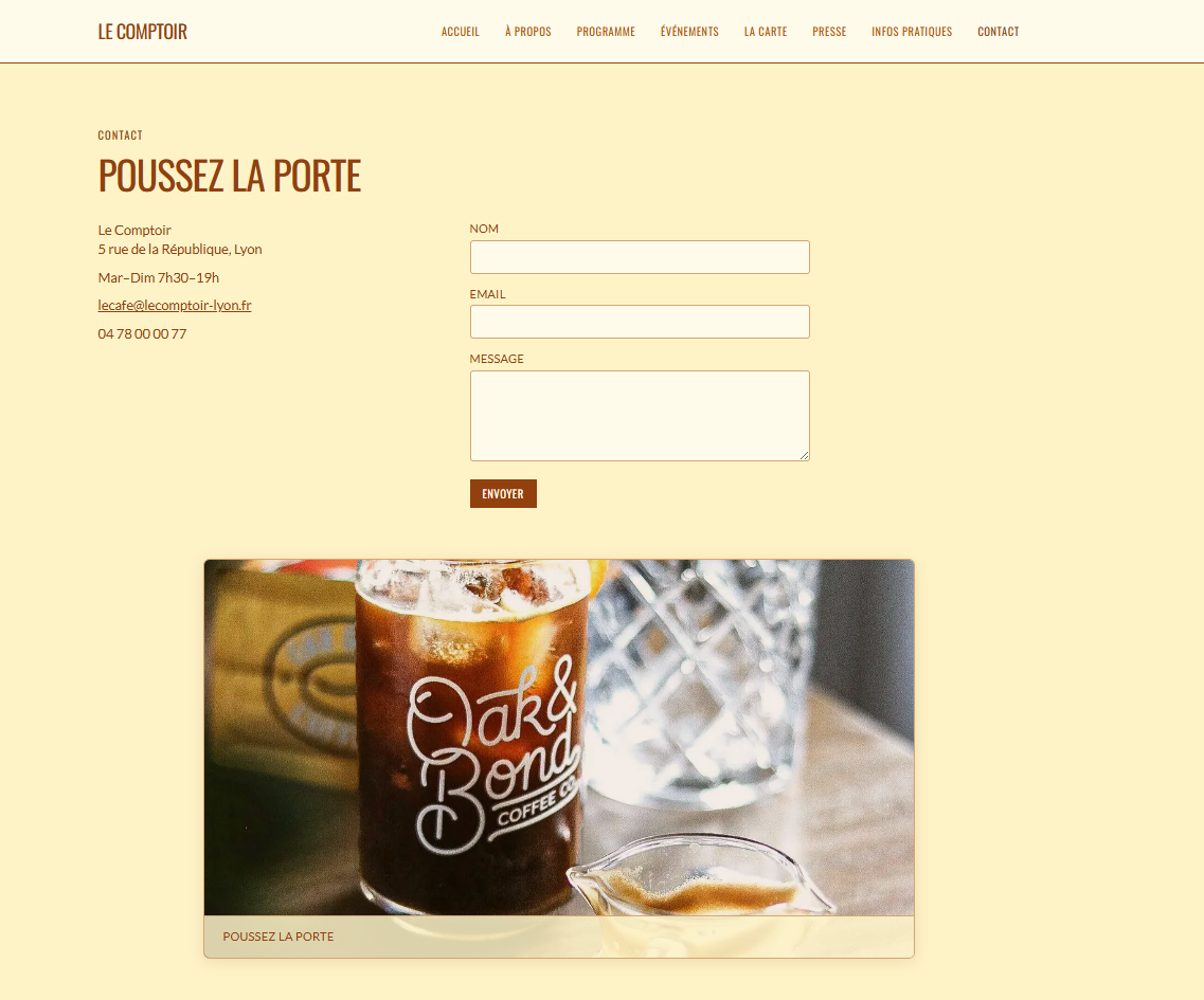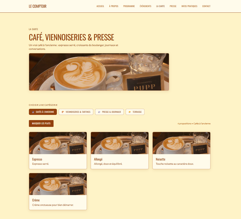 Site vitrine de café-restaurant aux tons rouges. Design chaleureux, carte des boissons et plats, réservation et contact. Réalisé avec Next.js et React, déployé sur Vercel.