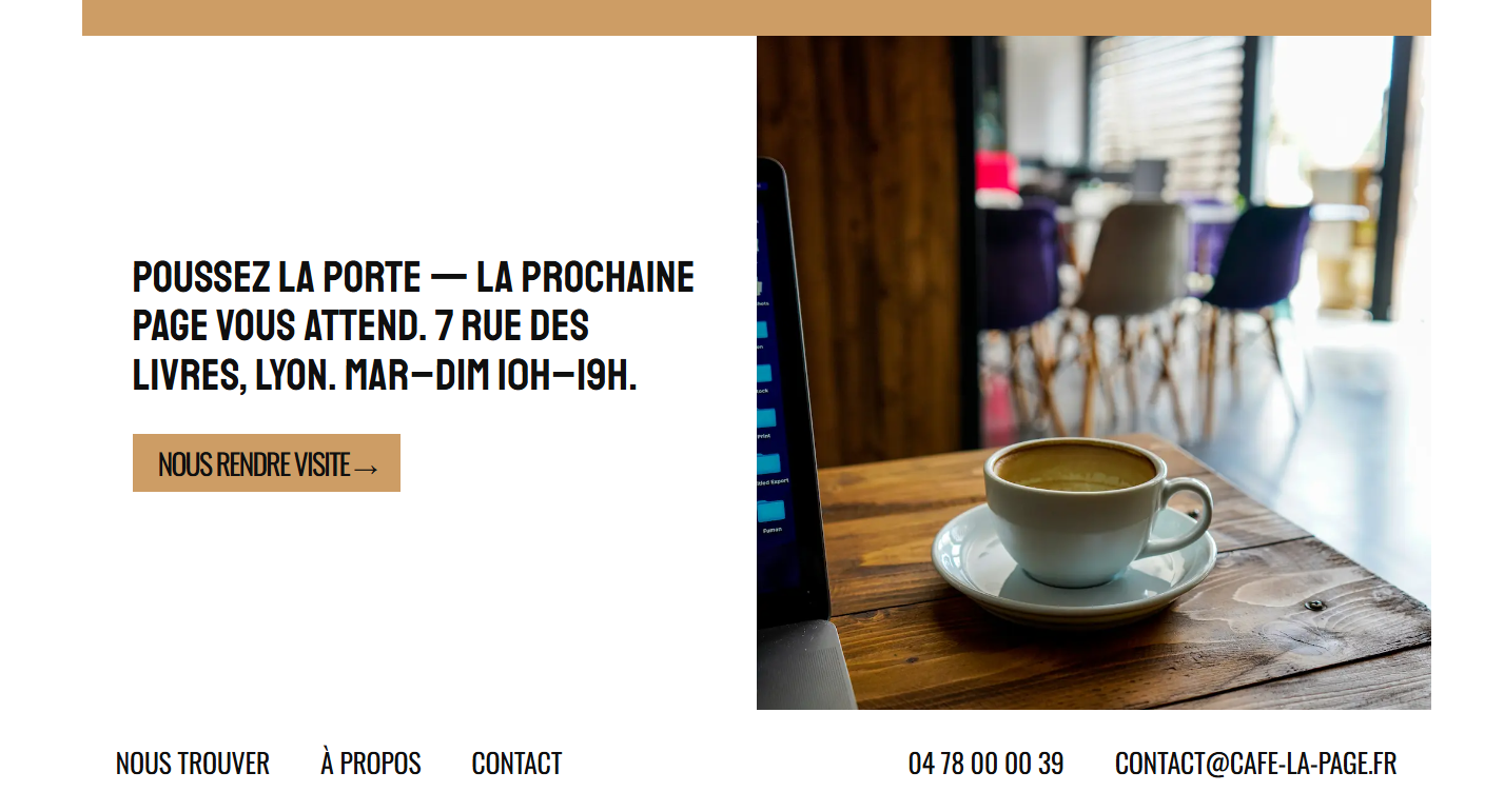 Site vitrine de café-restaurant. Design moderne, présentation du menu, horaires et contact. Mise en avant de l'ambiance et des spécialités. Réalisé avec Next.js et React, déployé sur Vercel.
