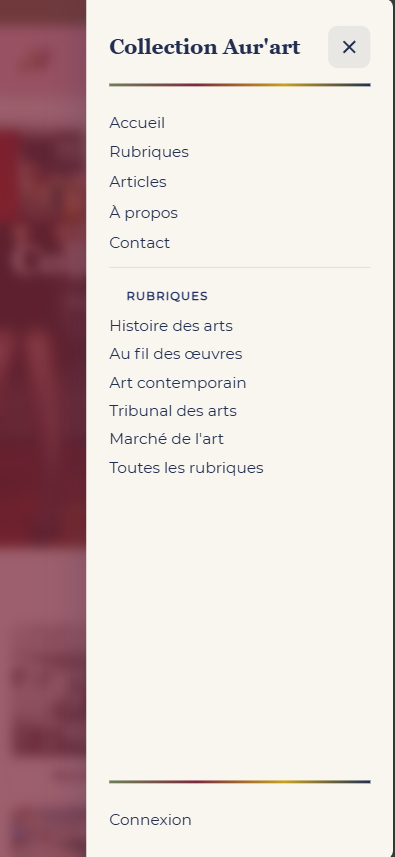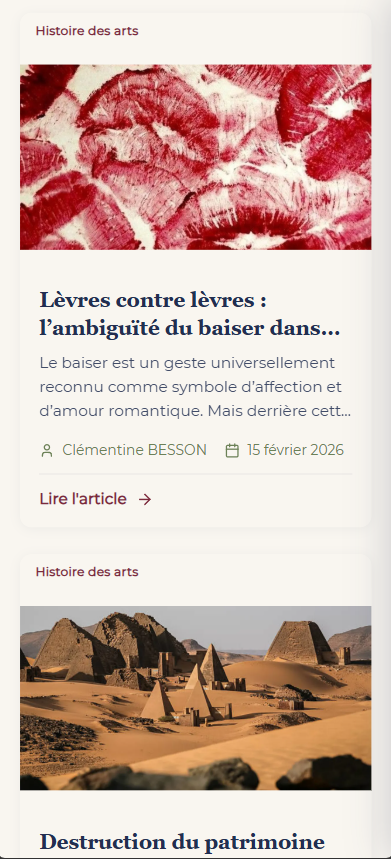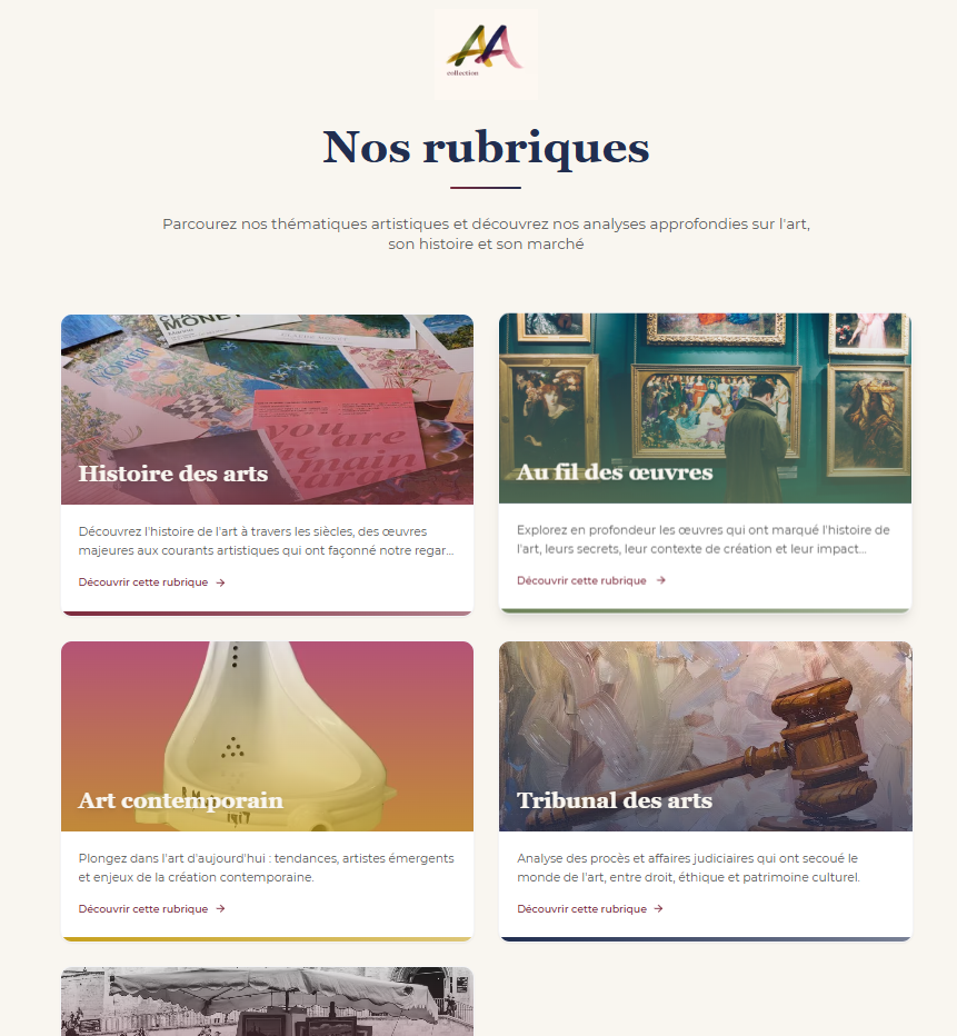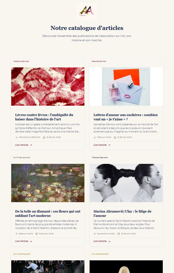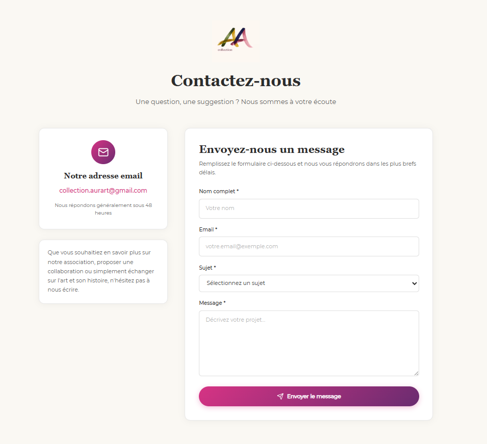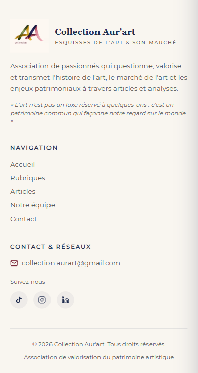 Site de l'association Collection Aur'art, projet fondateur : association de passionnés qui s'engage à valoriser le patrimoine artistique sous toutes ses formes. « Esquisses de l'Art & son marché » : rubriques, articles, présentation de l'équipe, contact. Design soigné (fond clair, dégradé violet/rose), typographie élégante. Conçu avec Next.js, React, JavaScript, déployé sur Vercel. Design UI/UX sous Figma.