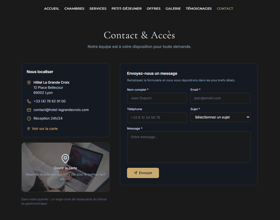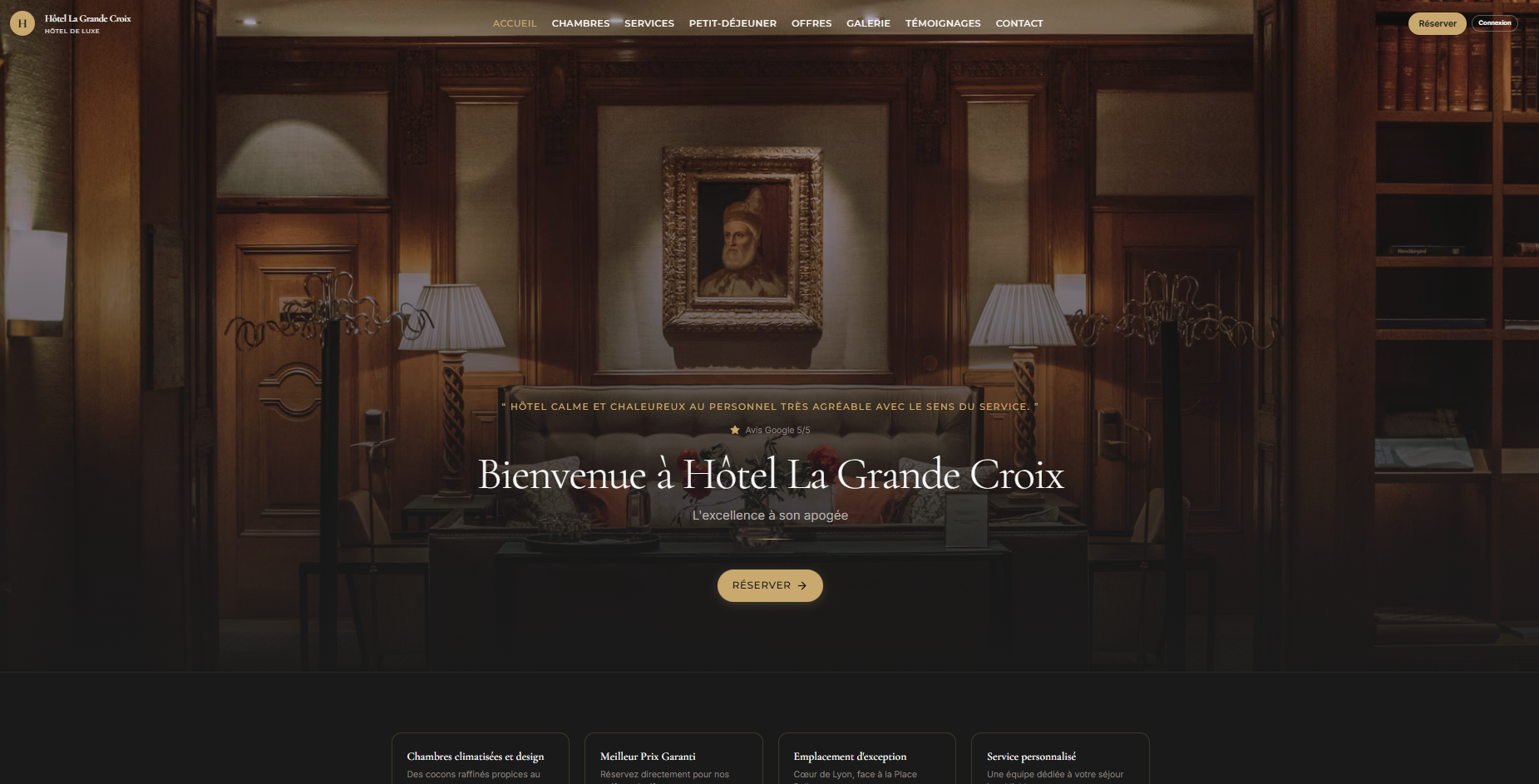 Site vitrine fictif de l'Hôtel La Grande Croix, établissement de charme à Lyon face à la Place Bellecour. Présentation des 37 chambres climatisées, du petit-déjeuner, des services (réception 24h/24, patio arboré, wi-fi gratuit) et formulaire de réservation. Design épuré et élégant, mise en avant du meilleur tarif garanti et de l'éco-responsabilité. Réalisé avec Next.js, React, déployé sur Vercel.