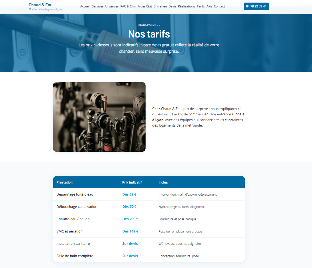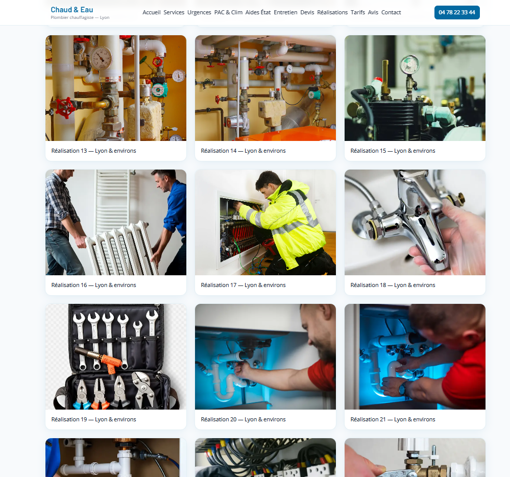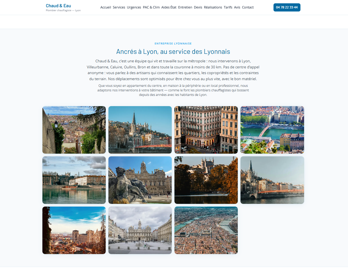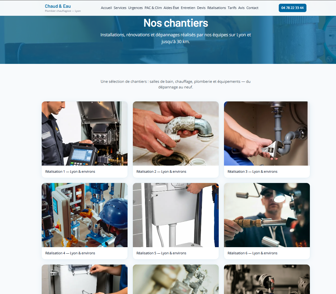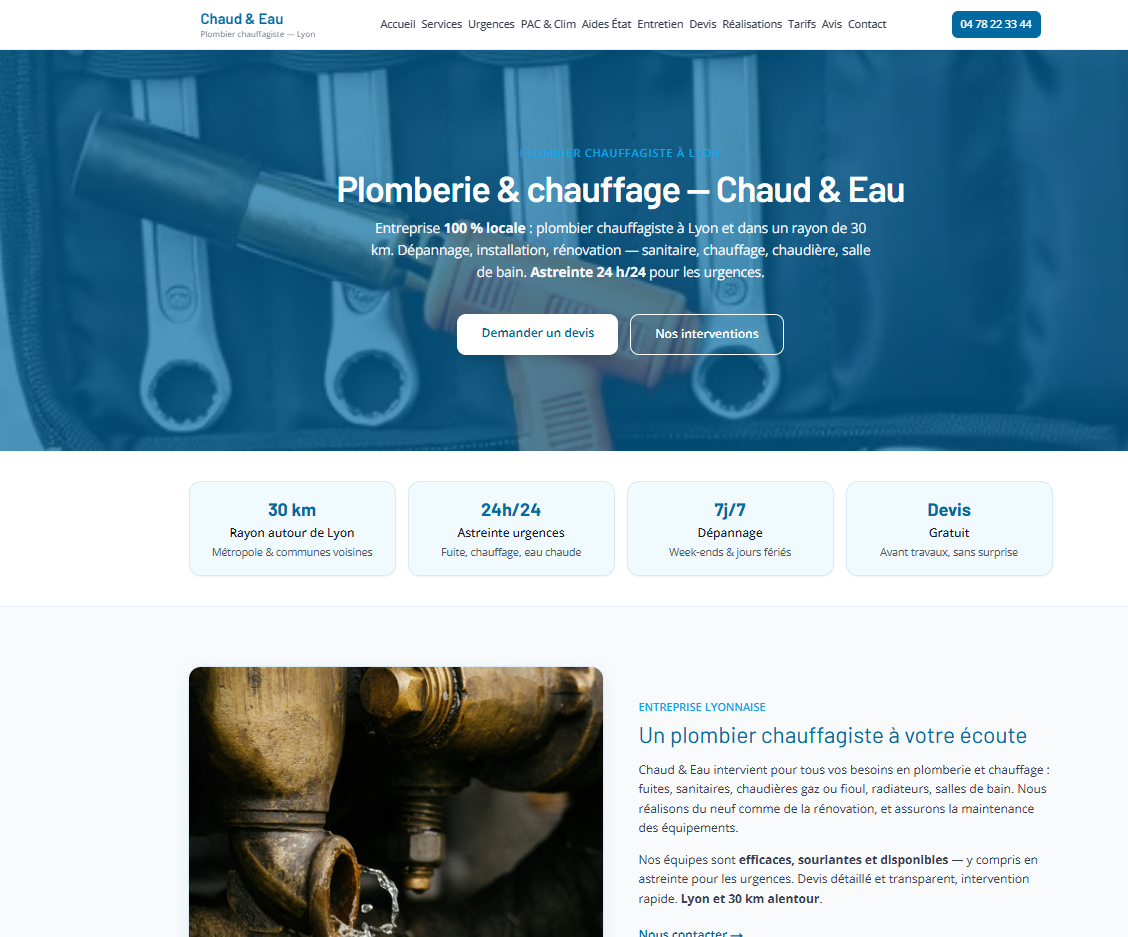 Site vitrine pour un plombier à Lyon : présentation des services (installation, dépannage, urgence), zone d'intervention, avis et formulaire de contact. Mise en avant de la confiance et de la réactivité, design épuré et navigation fluide sur mobile. Réalisé avec Next.js et React, déployé sur Vercel.