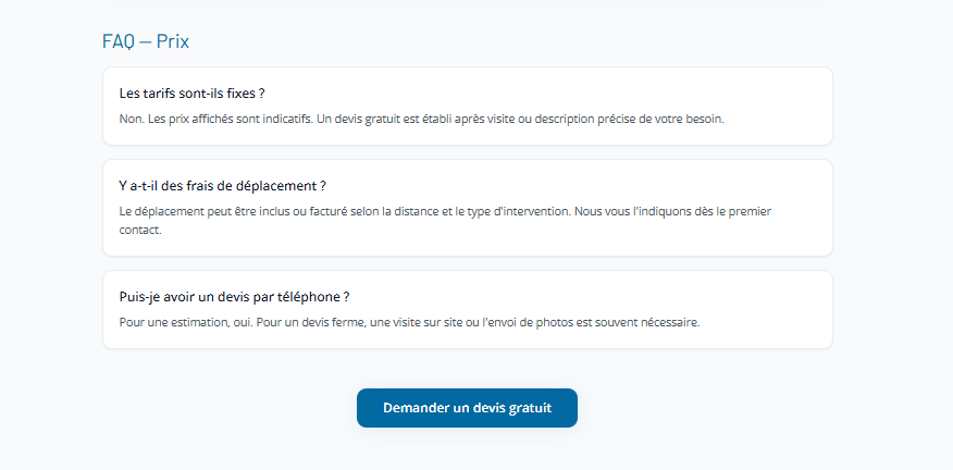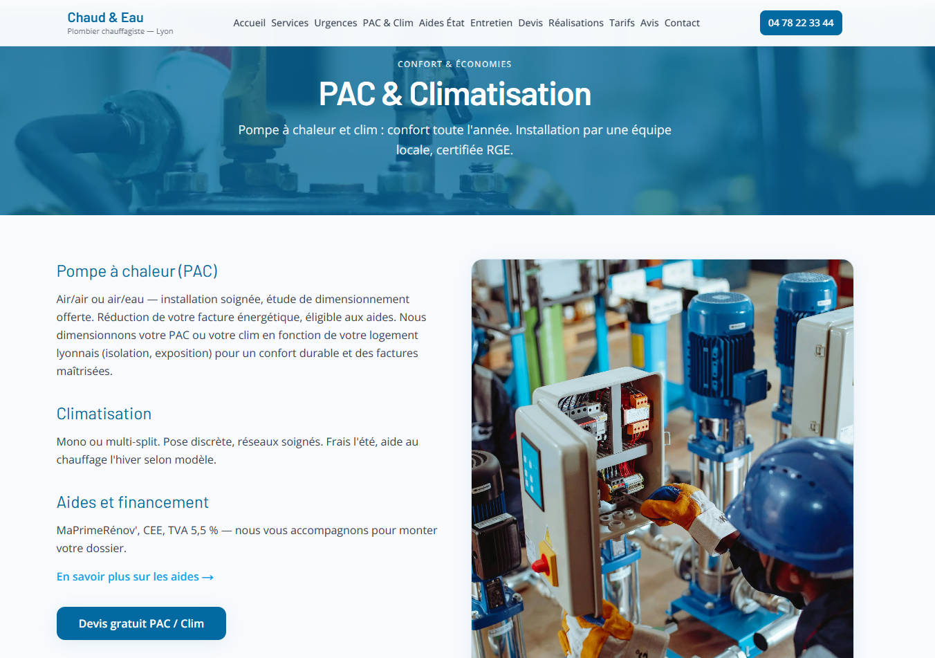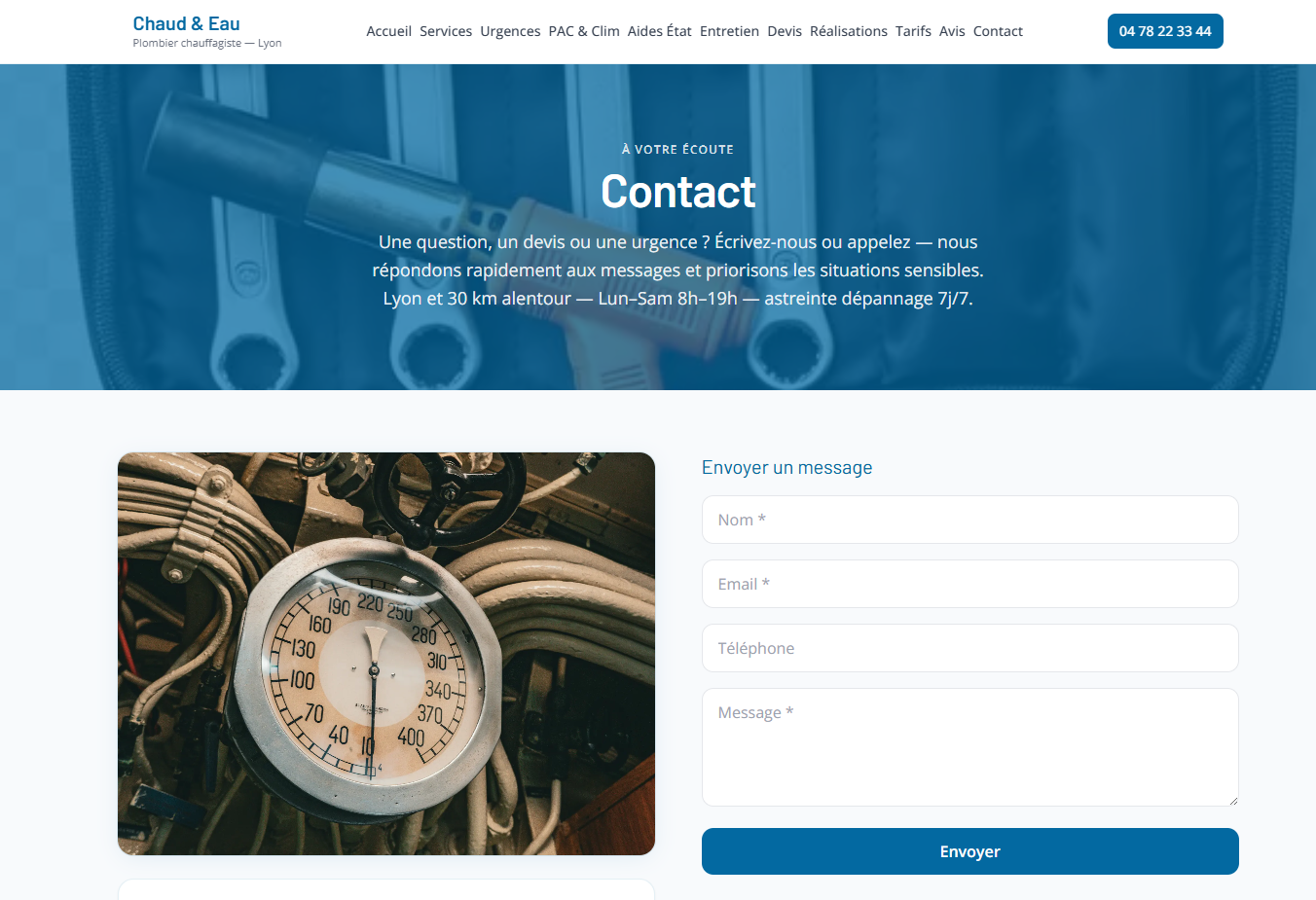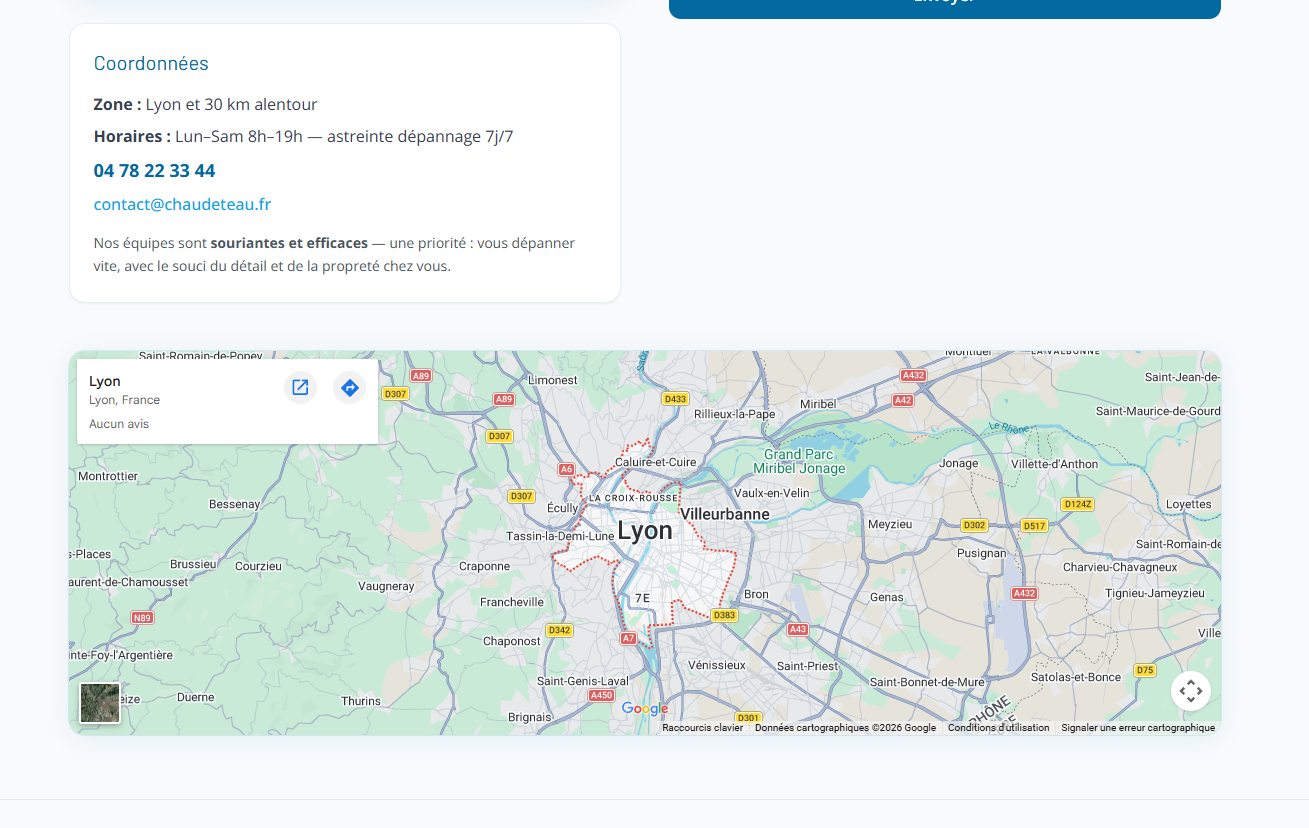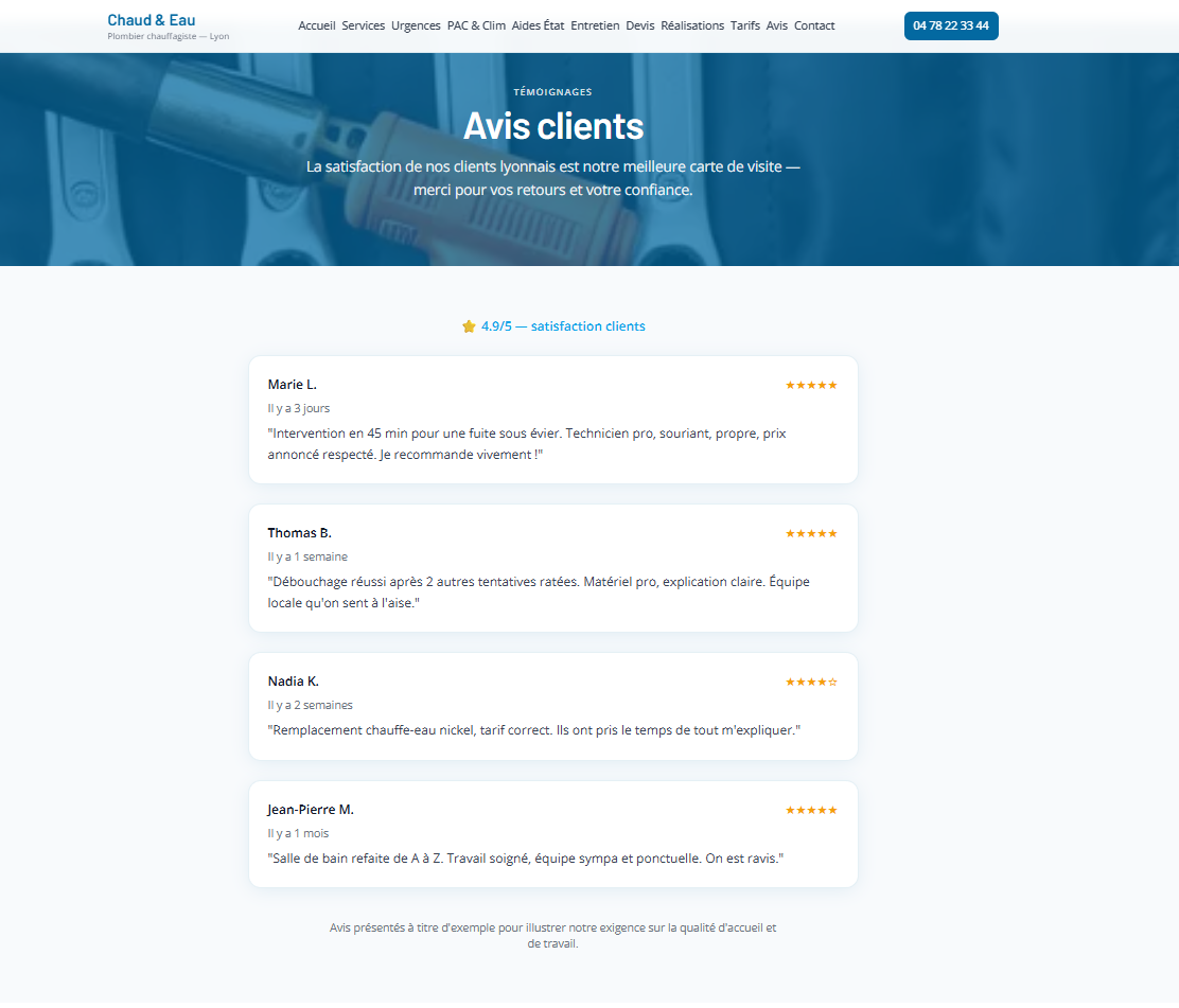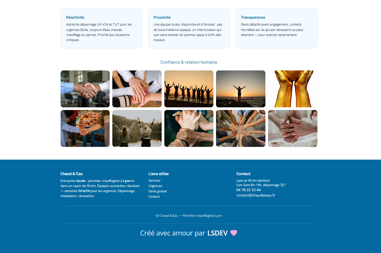 Site vitrine pour un plombier à Lyon : présentation des services (installation, dépannage, urgence), zone d'intervention, avis et formulaire de contact. Mise en avant de la confiance et de la réactivité, design épuré et navigation fluide sur mobile. Réalisé avec Next.js et React, déployé sur Vercel.
